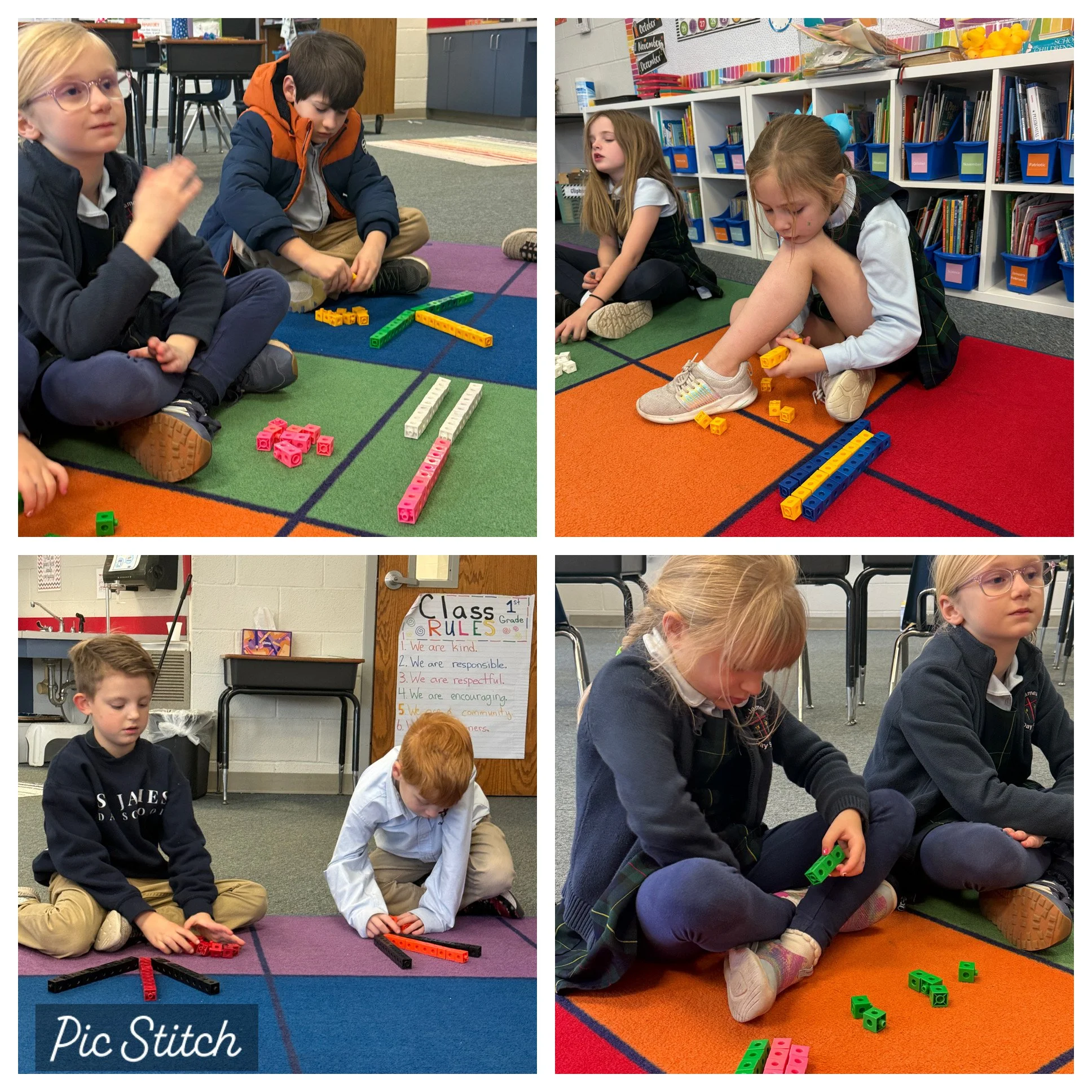 First graders started a new math module covering all aspects of place value to 100 and have really enjoyed building numbers using units of 10 and more with uni-fix cubes. Before each lesson’s new concept, students work through a “carpet math” warm up building different numbers using “10s” and “1s”, decomposing numbers into number bonds, and creating coordinating math sentences.