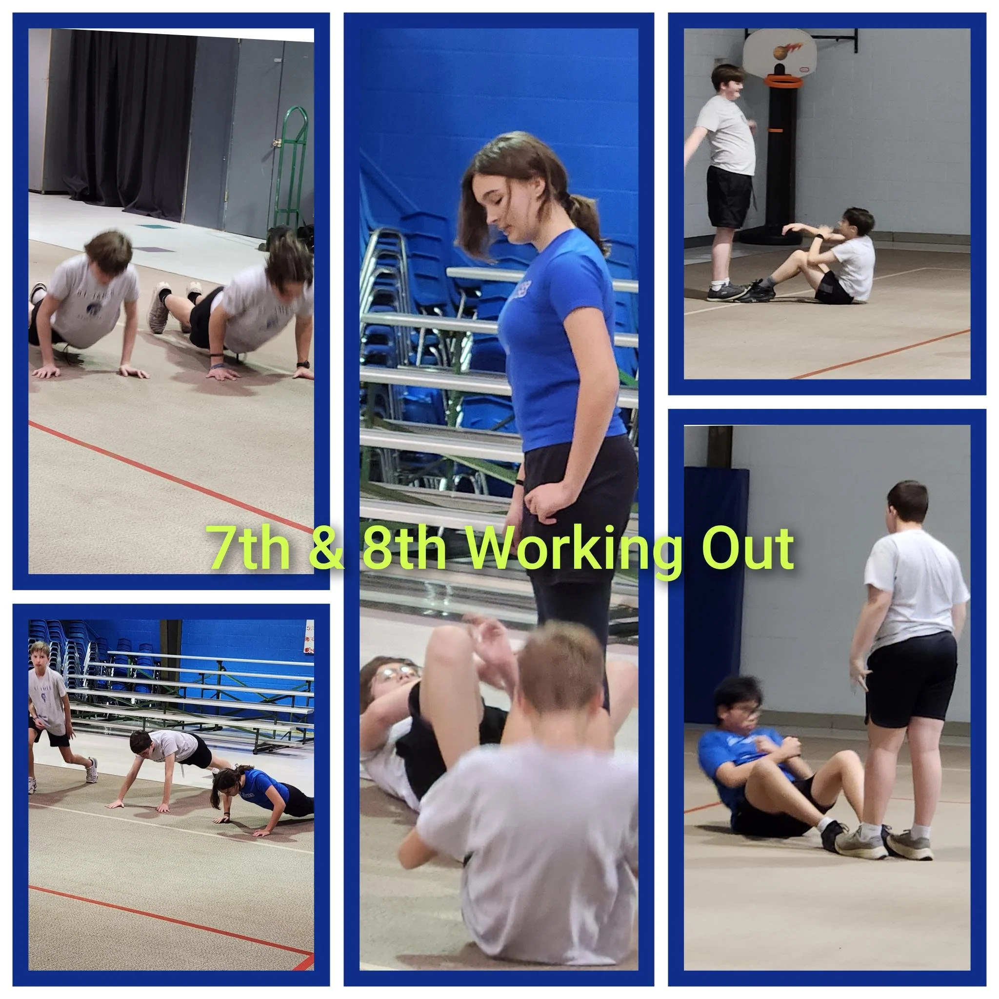 Here we have an example of a middle school work out day. We try to hit most of the muscle groups. Pictured is a work out day without using any equipment. Exercises are always more fun when you have a buddy! So find you a buddy and get active!