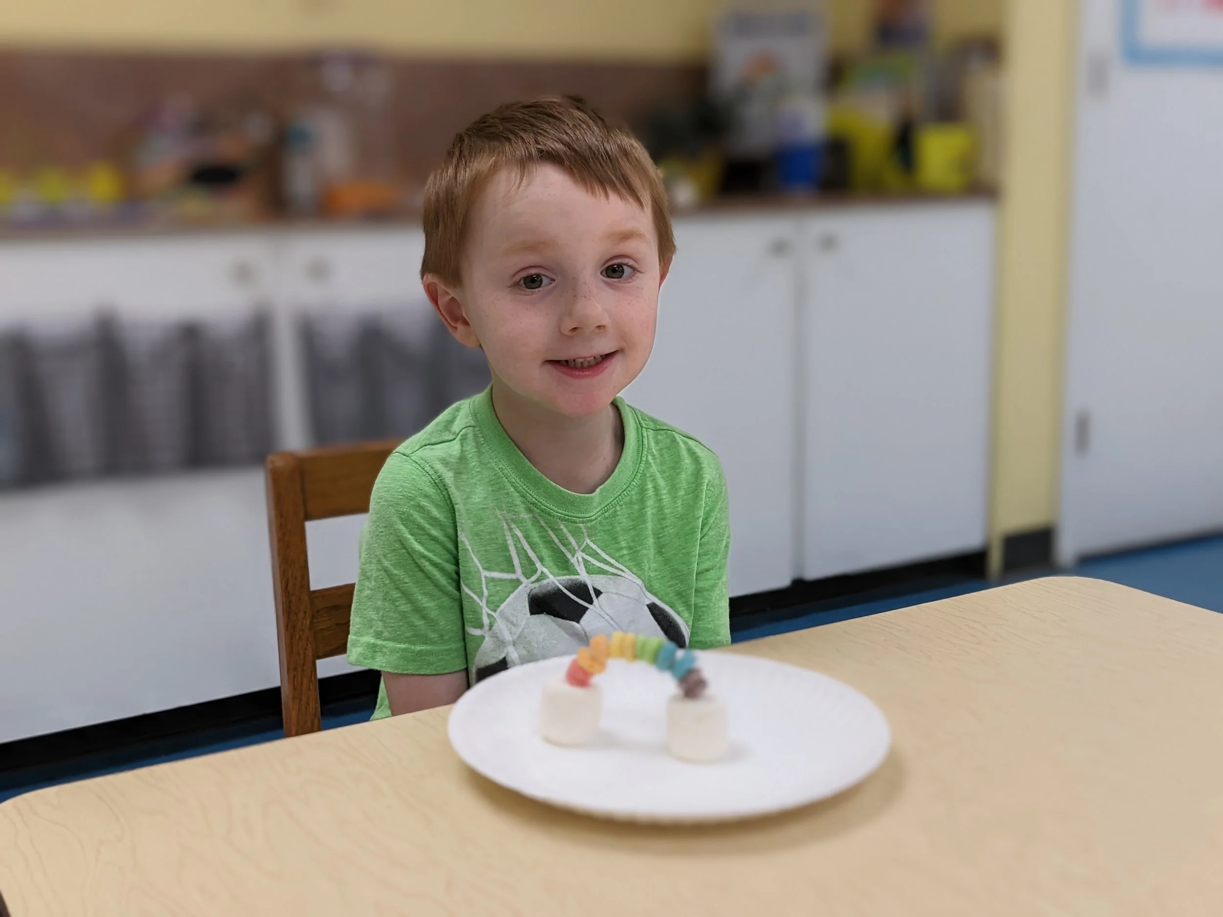 The class had fun stringing fruit loops onto pipe cleaners to make a rainbow. The best part was eating them.