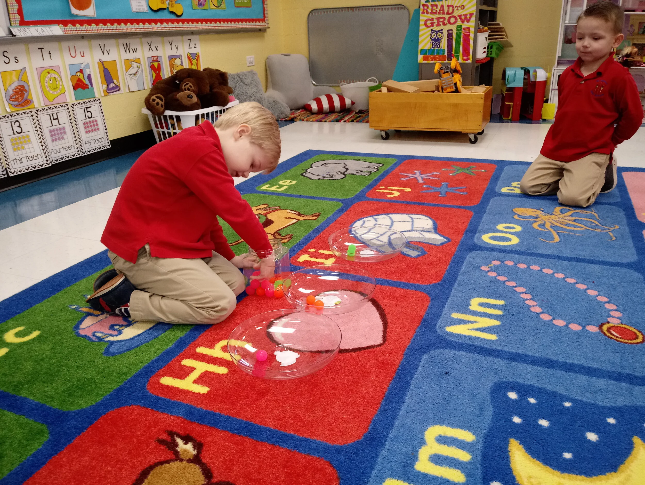 In order for children to develop the knowledge needed for later formal learning, they need frequent practice with materials in play settings and adult-guided activities. Some of the activities include meaningful discussions and applications. One of our activities is a guessing jar. The students had to guess if we had more or fewer than 10 balls in our jar. We recorded our answers and counted to see how many balls were in the jar. There were 22. The boys and girls also noticed that there were 3 different colors, so we decided to classify and count them. Everyone had fun, but we were also learning.