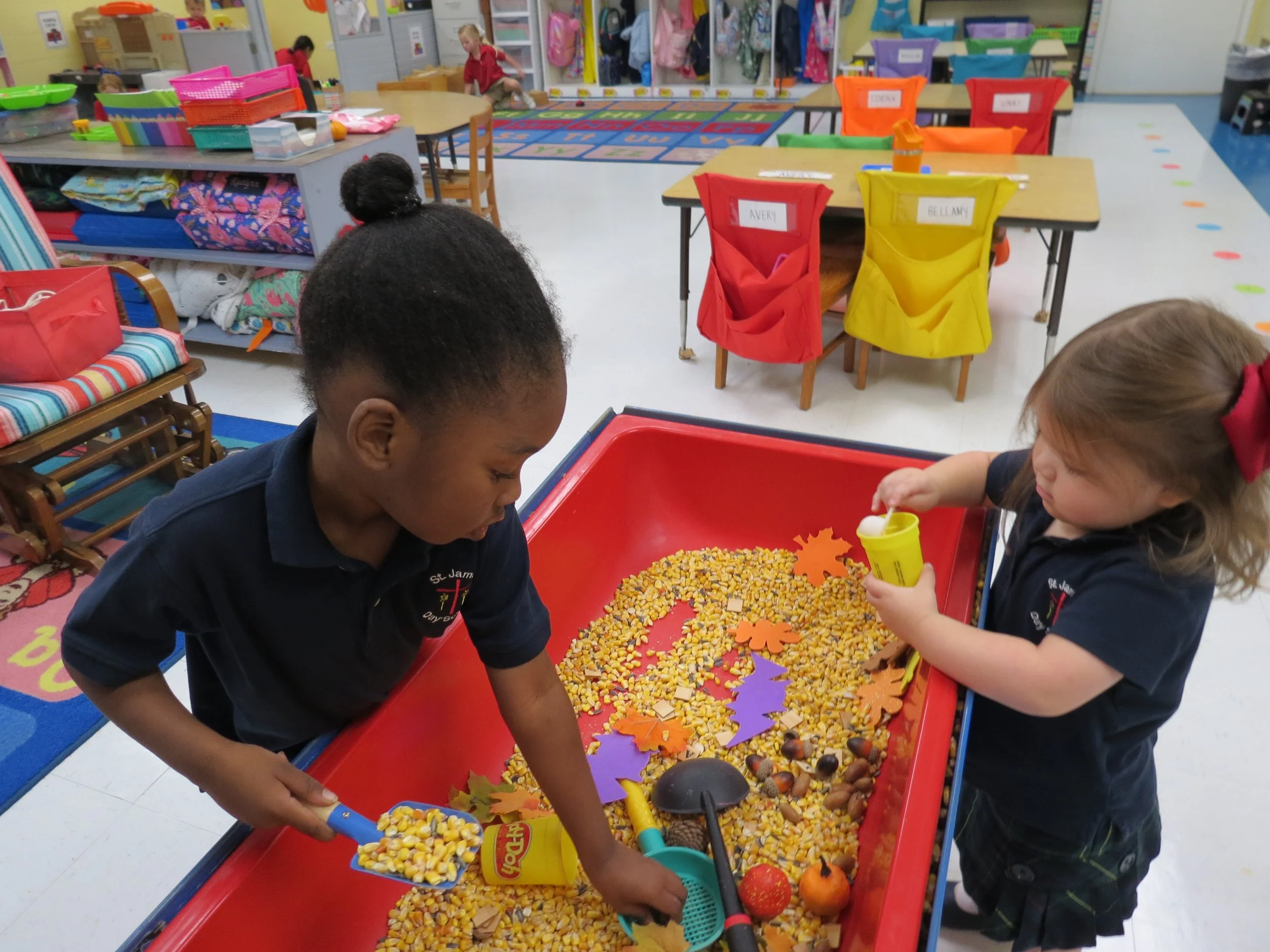 With Fall finally here, the children helped me put fall decorations in our sensory bin and they have been enjoying making their own play-doh pumpkin.